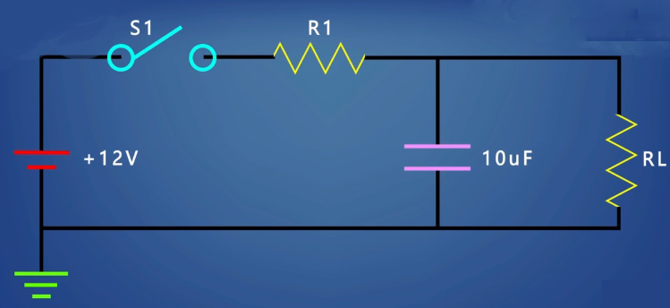 首先要找到有电流的地方。有电压和闭合回路的地方就有电流。以下图为例,S1闭合时,电压为+12V。因为电流总要留到电源的负极,所以这时闭合回路经过10uF电容,同时也包括RL电阻。但是这里只考虑闭合瞬间,因为电容阻抗比较低,所以电流主要流过电容,所以忽略RL路径。S1断开时,电源被断开,电路中只剩下电容对电路提供能量,闭合回路则剩下电容到电阻RL的这一个小环。整个电路的电阻RL的用处是让电流不会太大,让电容充电速度得到控制。